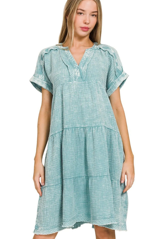 Zenana Washed Double Gauze Raw Edge V-neck Dress