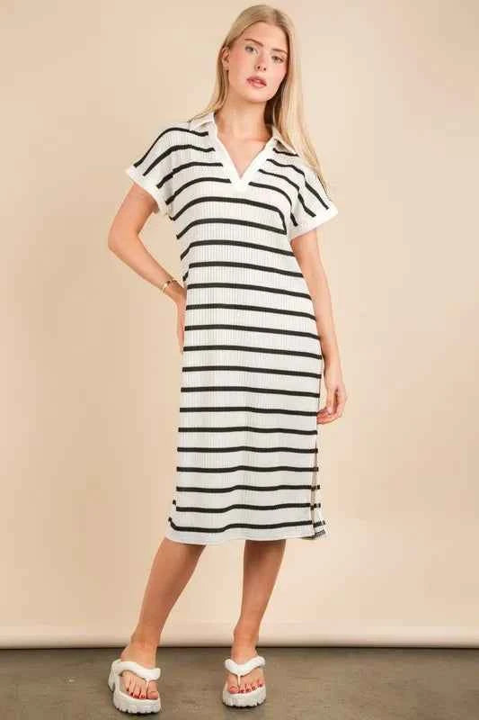 VERY J Oversized Collared Striped Knit Midi Dress