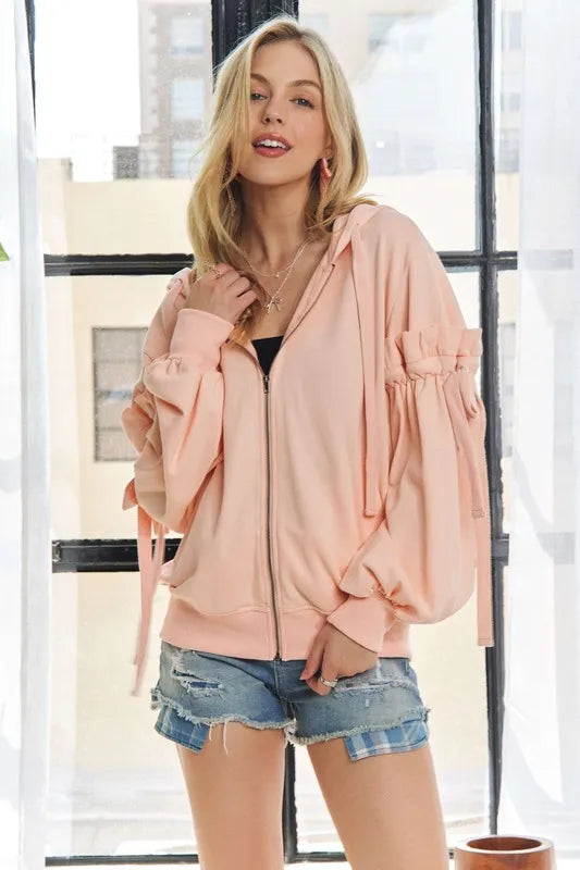 ADORA Chic Ruffled Puff Sleeve Zip-Up Hoodie - Comfort & Style Combined