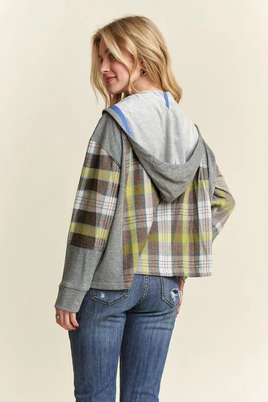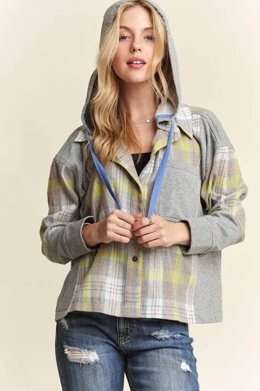 The Button Down Plaid Hoodie Shacket combines the style of a plaid shirt with the comfort of a hoodie. It features a button-down front for easy wear and a hood for added warmth and style. This versatile piece can be styled casually or dressed up for a trendy and cozy look.