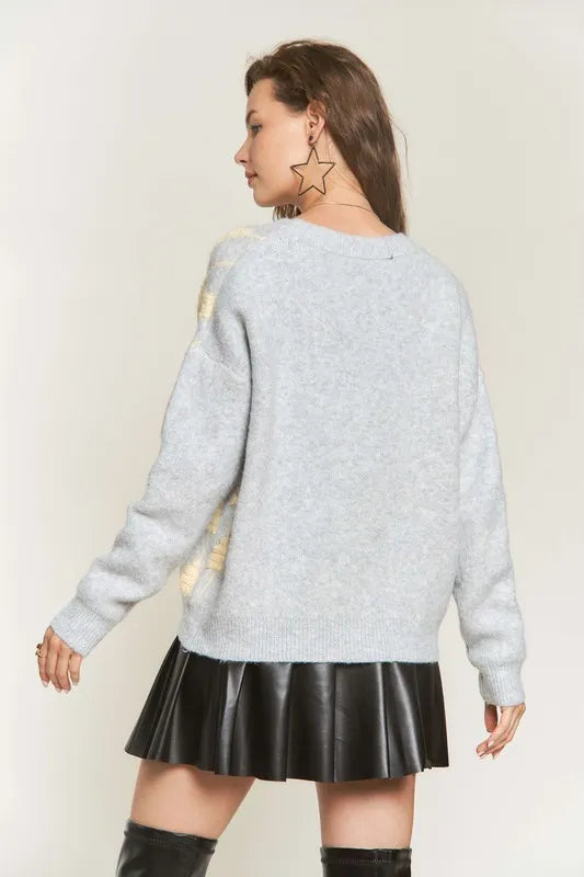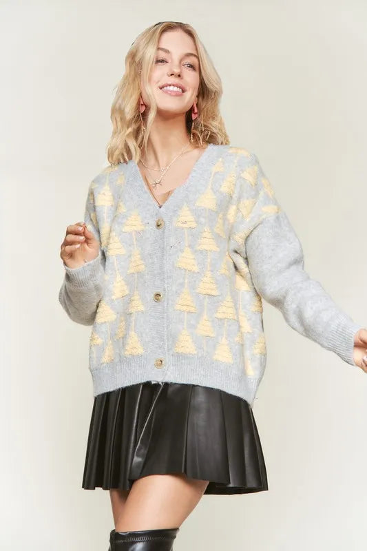 The fluffy tree accent cardigan is a cozy and whimsical addition to your wardrobe. With its fluffy texture and tree design accents, this cardigan adds a touch of fun and charm to any outfit. Perfect for layering over a simple top or dress, it will keep you warm and stylish during the colder months.