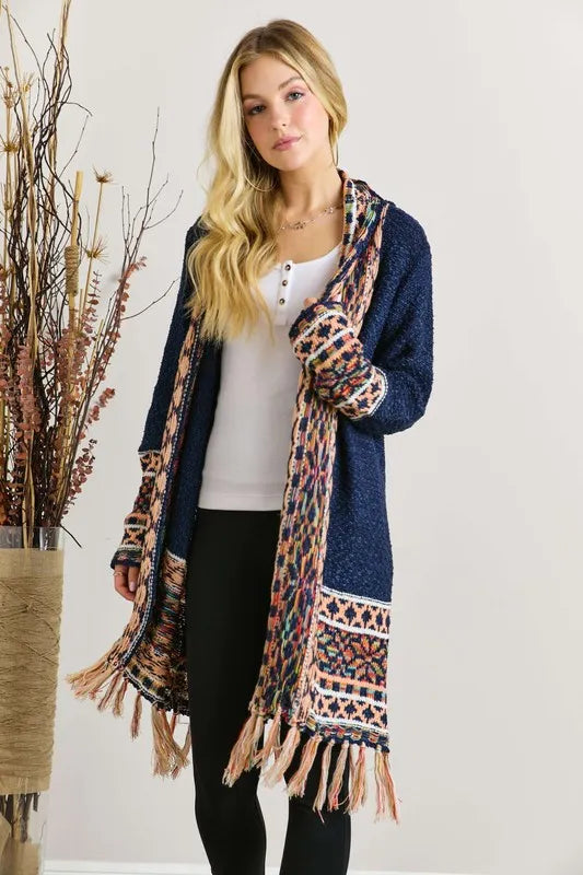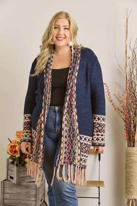 Bohemian Aztec Border Cardigan with Fringe Hem in Plus Sizes