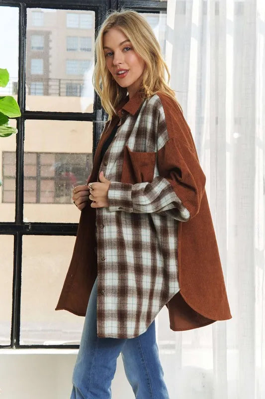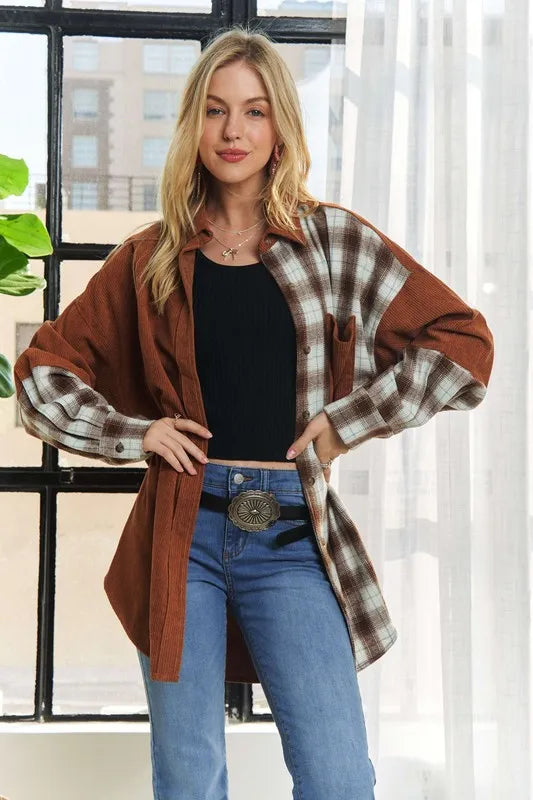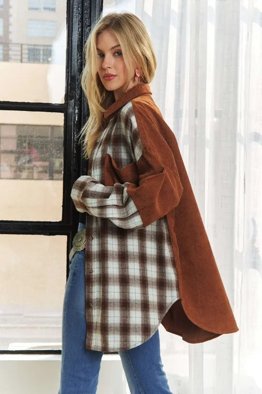 Trendy ADORA Corduroy Shacket with Plaid Contrast Detailing