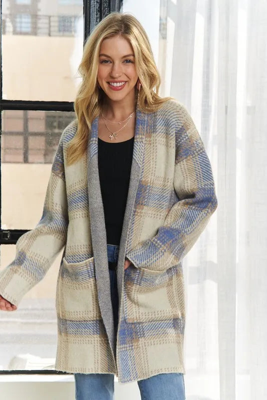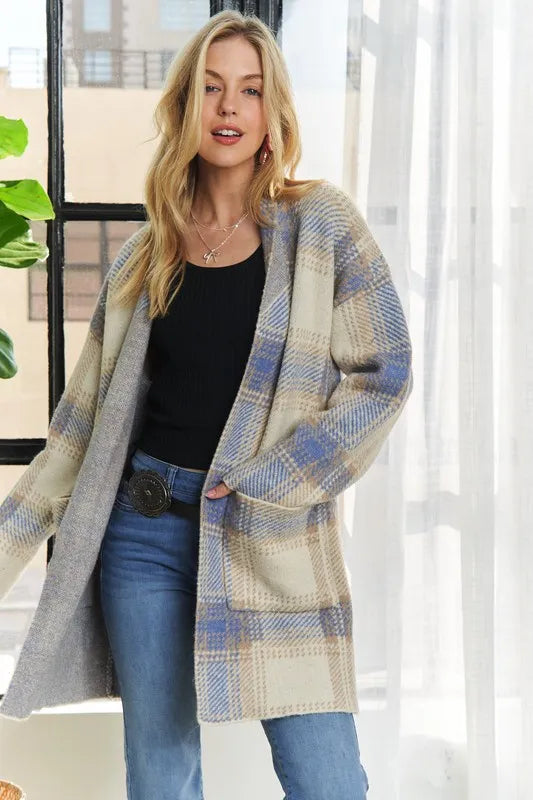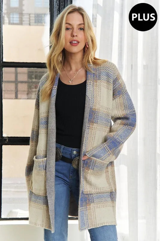 ADORA Classic Plus Size Checked Cardigan with Pockets