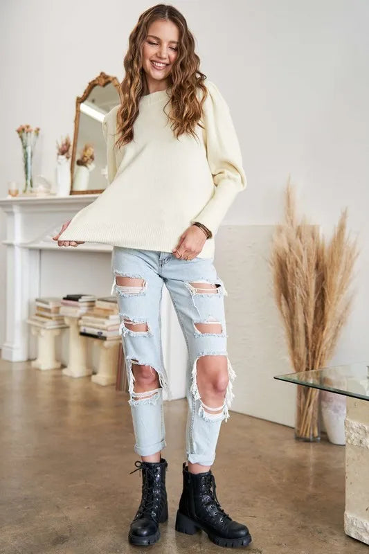 The Puff Shoulder Sweater is a fashionable and statement-making piece featuring voluminous puff shoulders for a dramatic and trendy look. This sweater adds a touch of sophistication and flair to any outfit, making it a versatile choice for both casual and dressy occasions. With its unique silhouette and cozy knit fabric, the Puff Shoulder Sweater is a stylish and comfortable option for staying chic and warm.