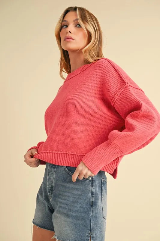 Aemi+Co Chic Round Neck Sweater with Ribbed Hem & Exposed Seams