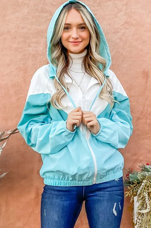 This jacket features a stylish color block design, combining different colored panels for a modern and sporty look. The windbreaker style offers protection from the elements while adding a trendy touch to your outfit. Perfect for outdoor activities or casual wear, this lightweight jacket can be easily layered over a variety of outfits for a pop of color and style.