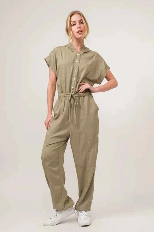Effortlessly cool and comfortable, this Washed Short Sleeve Hooded Jumpsuit is a must-have for your casual wardrobe. The washed fabric gives it a relaxed and lived-in look. The short sleeves and hood add a sporty touch to this versatile one-piece outfit. Perfect for running errands or lounging at home, this jumpsuit combines style and comfort effortlessly. Stay on-trend and comfy with this laid-back essential.