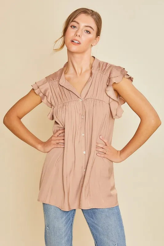 The ruffle sleeve shirred flowy woven tunic shirt is a feminine and flowy top with stylish ruffled sleeves and shirred details. This tunic shirt offers a flattering and relaxed fit that drapes beautifully. The flowy woven fabric adds a touch of elegance and movement to the design. Pair it with leggings or slim-fit pants for a chic and comfortable outfit that can easily transition from day to evening wear.