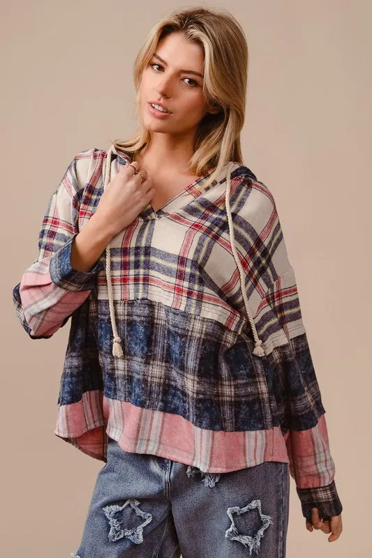 BiBi Chic Plaid Drawstring Hoodie with Drop Shoulder Design