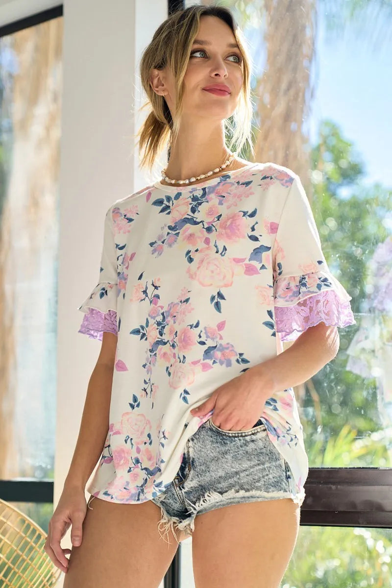 BiBi Chic Floral Print Top with Romantic Lace Sleeves