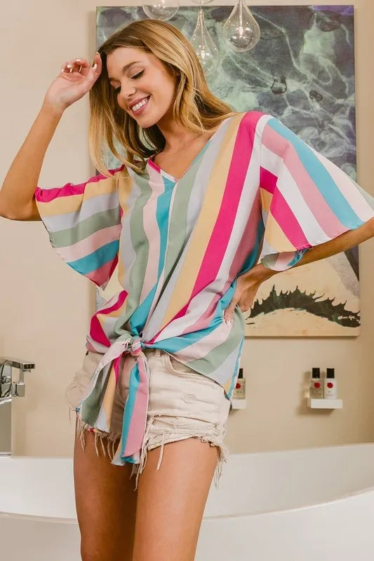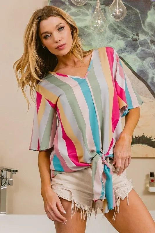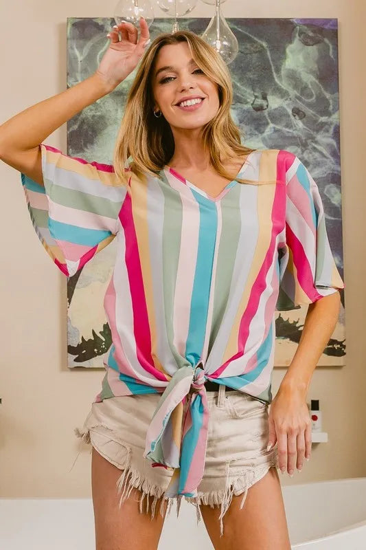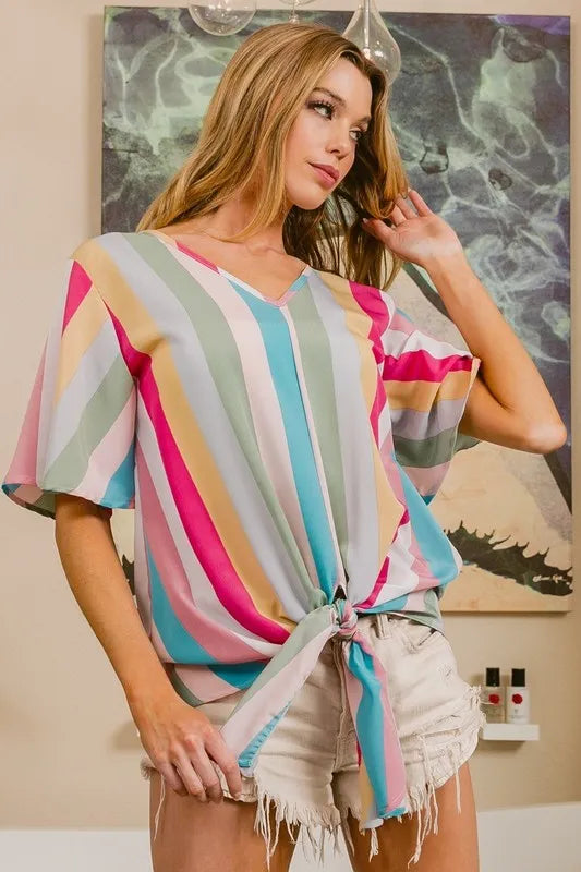 Chic Multi-Stripe Woven V-Neck Top with Long Front Tie
