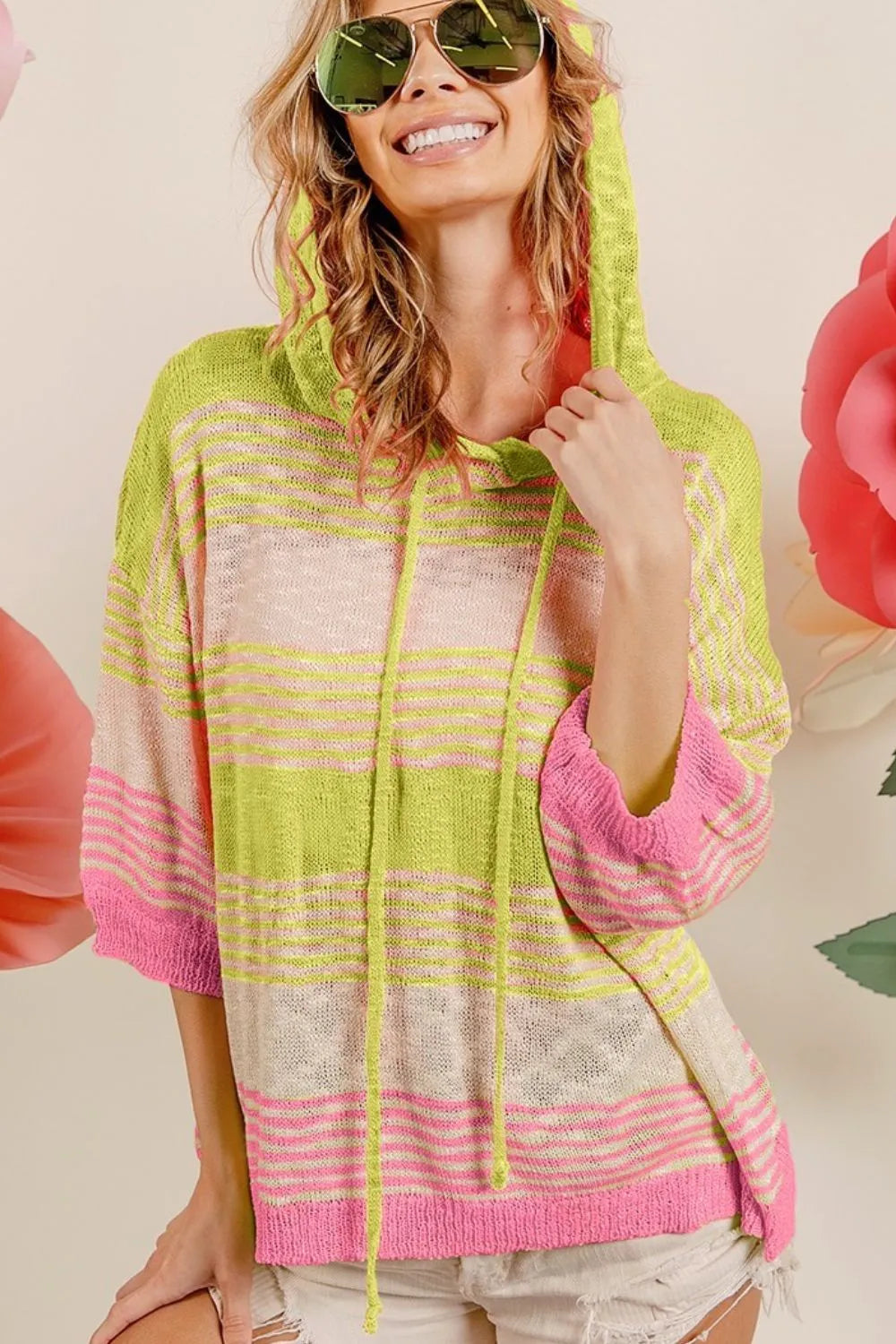 BiBi Striped Short Sleeve Lightweight Knit Hoodie