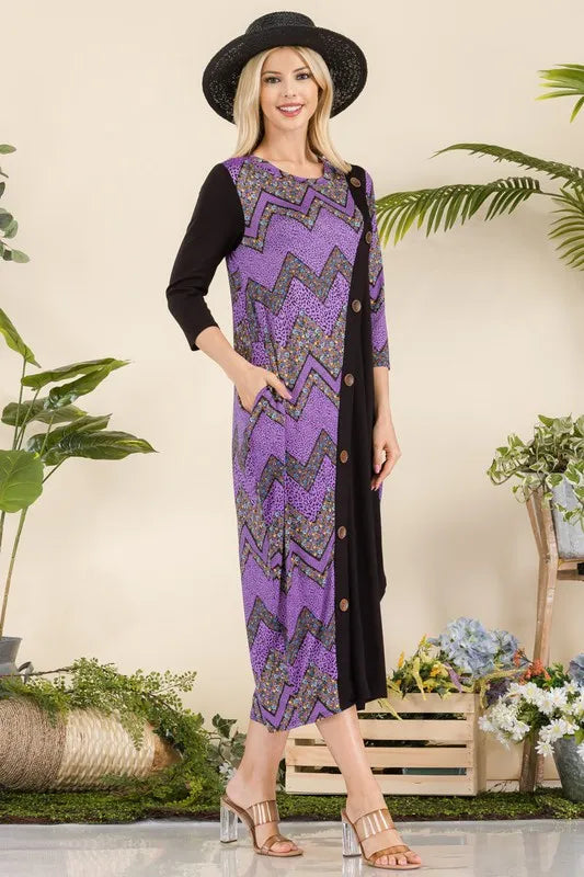 Celeste Geo Print Plus Size Dress with Sophisticated Button Detailing