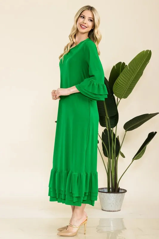 This modest midi dress with 3/4 ruffle bell sleeves is a sophisticated and stylish choice for various occasions. The midi length offers a classic and elegant silhouette. The 3/4 ruffle bell sleeves add a touch of femininity and charm to the dress. Perfect for both casual and dressy events, this dress is versatile and chic. Make a fashion statement with this lovely modest midi dress featuring 3/4 ruffle bell sleeves.