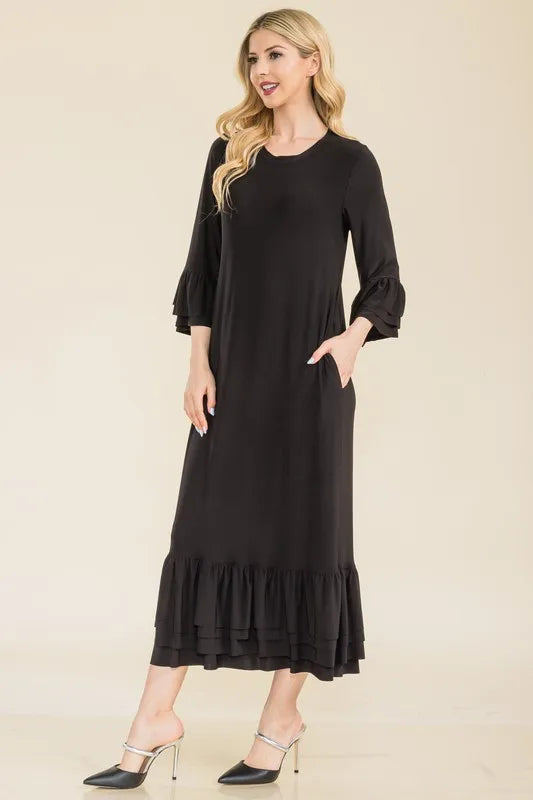 This modest midi dress with 3/4 ruffle bell sleeves is a sophisticated and stylish choice for various occasions. The midi length offers a classic and elegant silhouette. The 3/4 ruffle bell sleeves add a touch of femininity and charm to the dress. Perfect for both casual and dressy events, this dress is versatile and chic. Make a fashion statement with this lovely modest midi dress featuring 3/4 ruffle bell sleeves.