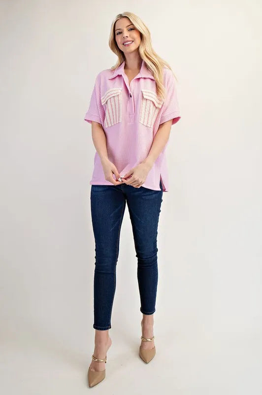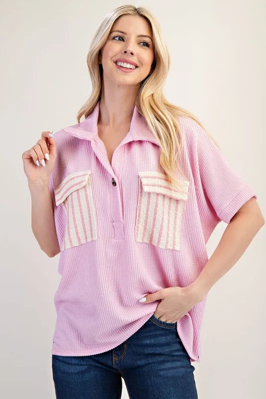 Add a touch of sophistication to your outfit with this Rib Knit Collared Top featuring stylish Striped Pockets. The ribbed knit fabric gives a cozy and comfortable feel, while the collared neckline adds a polished look. The striped pockets provide a trendy pop of pattern and contrast. This top is versatile and perfect for both casual and office wear. Pair it with your favorite pants or skirt for a chic and effortlessly put-together look.