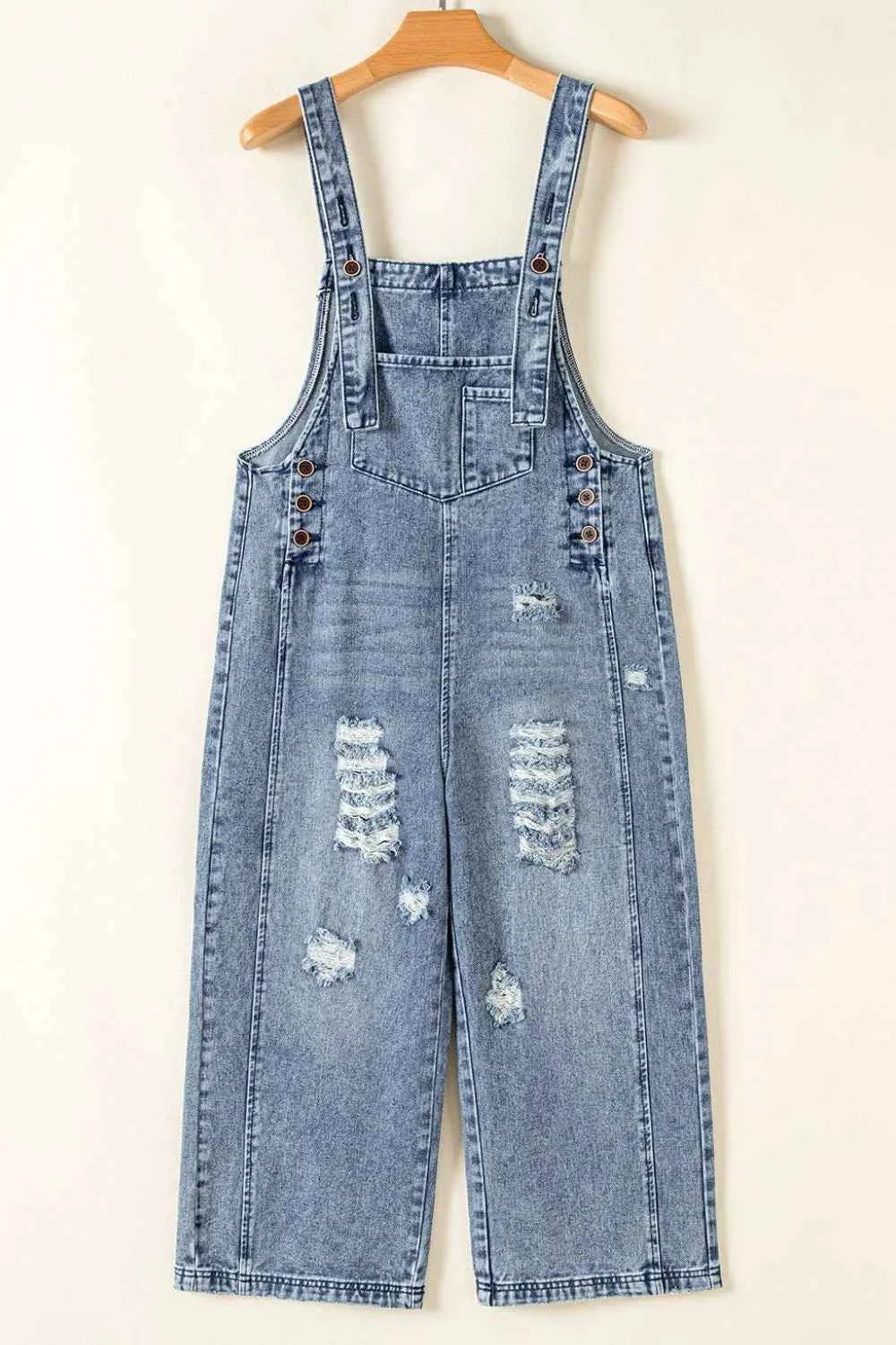 Distressed Bib Pocket Wide Leg Denim Overalls