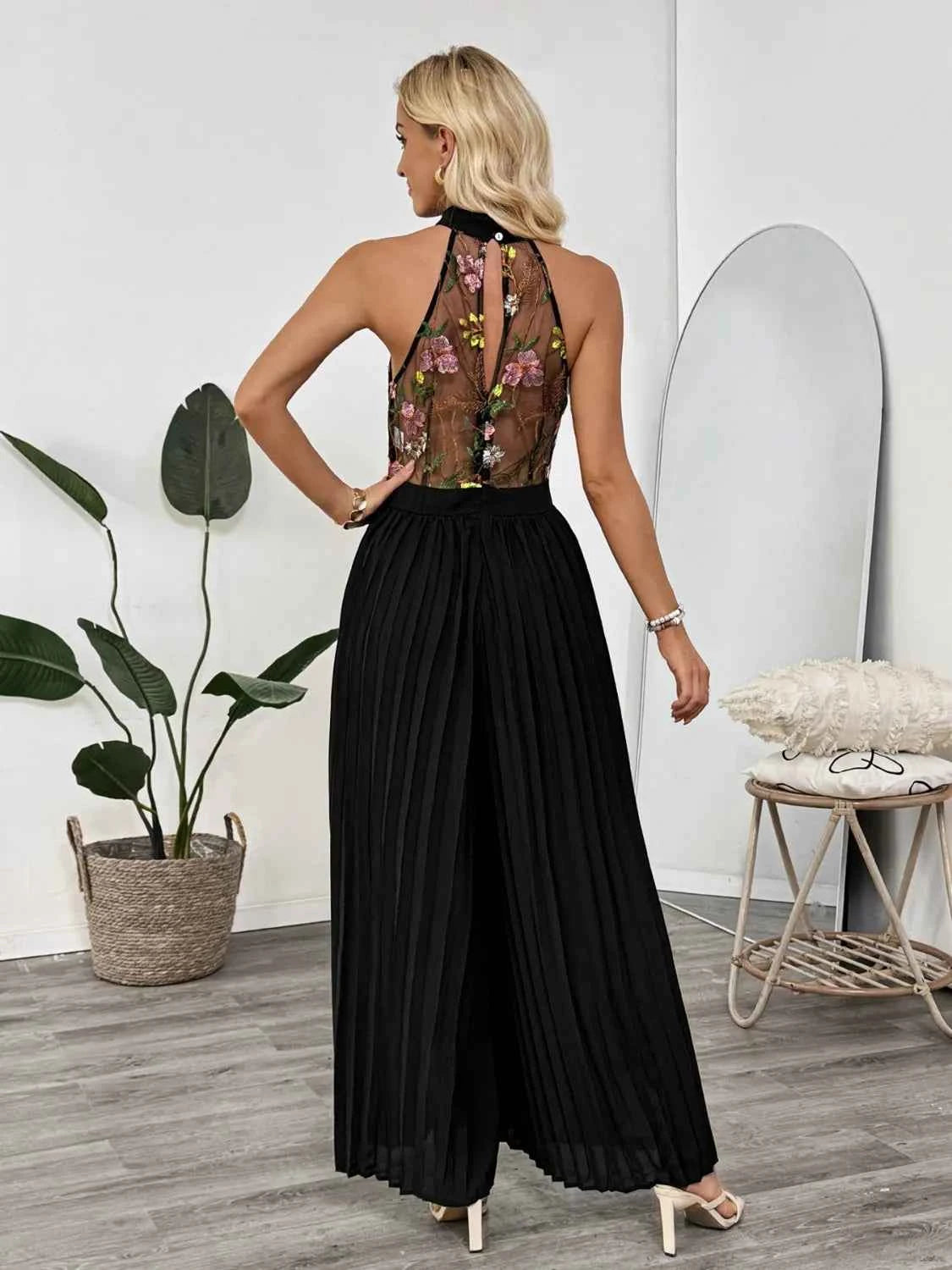 Floral Embroidered Halter Neck Pleated Jumpsuit
