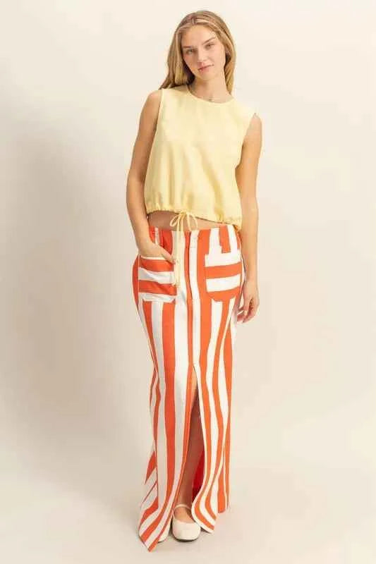 This maxi skirt features a classic striped pattern with pocket details for added functionality and style. The striped design adds a timeless and versatile element to the skirt, while the pockets provide a practical touch. Perfect for creating effortless and chic looks, this striped maxi skirt is a fashionable wardrobe essential that combines comfort and sophistication.