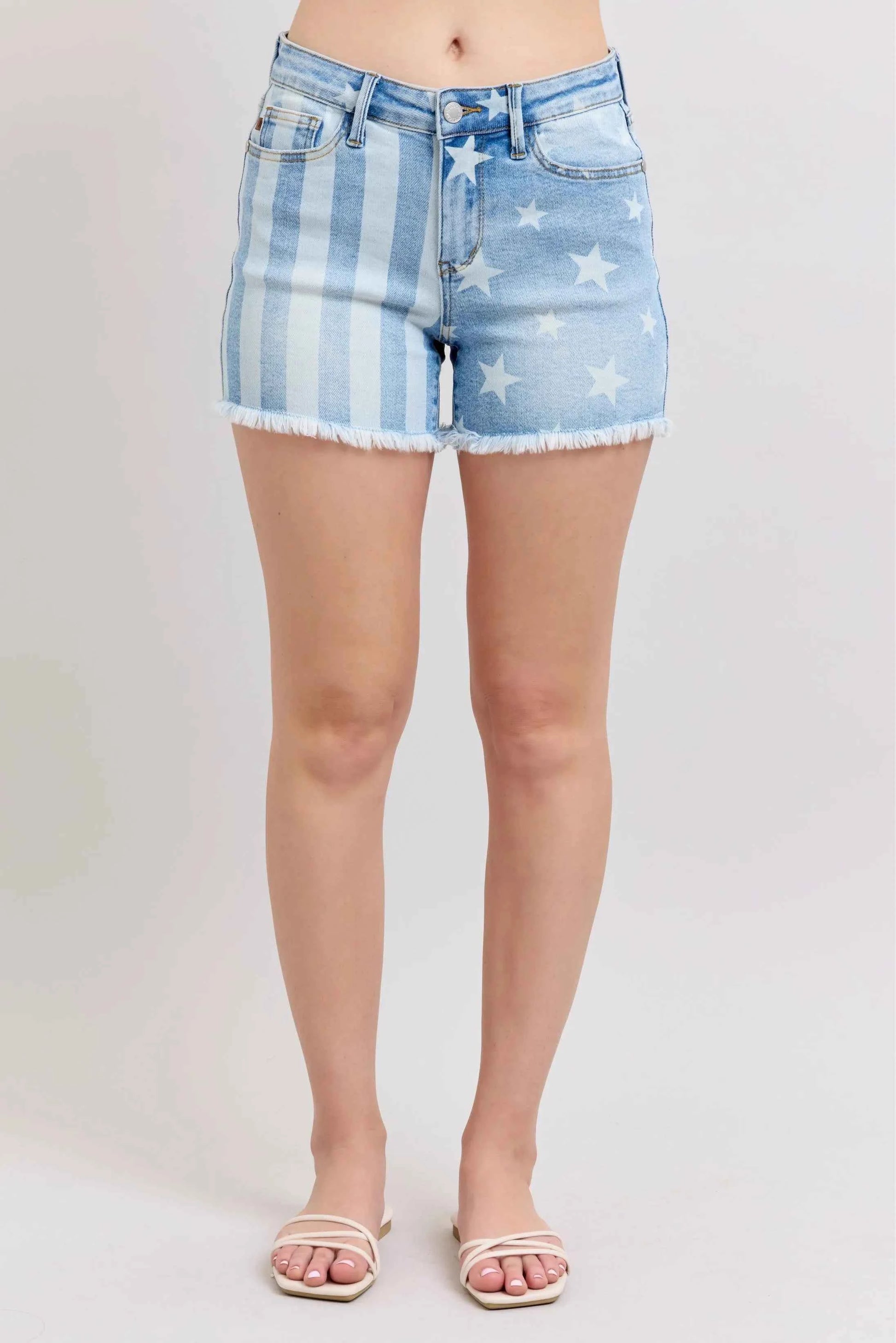 Judy Blue Full Size Mr Star & Stripe Bleach Discharge Fray Hem Denim Shorts Plus Size