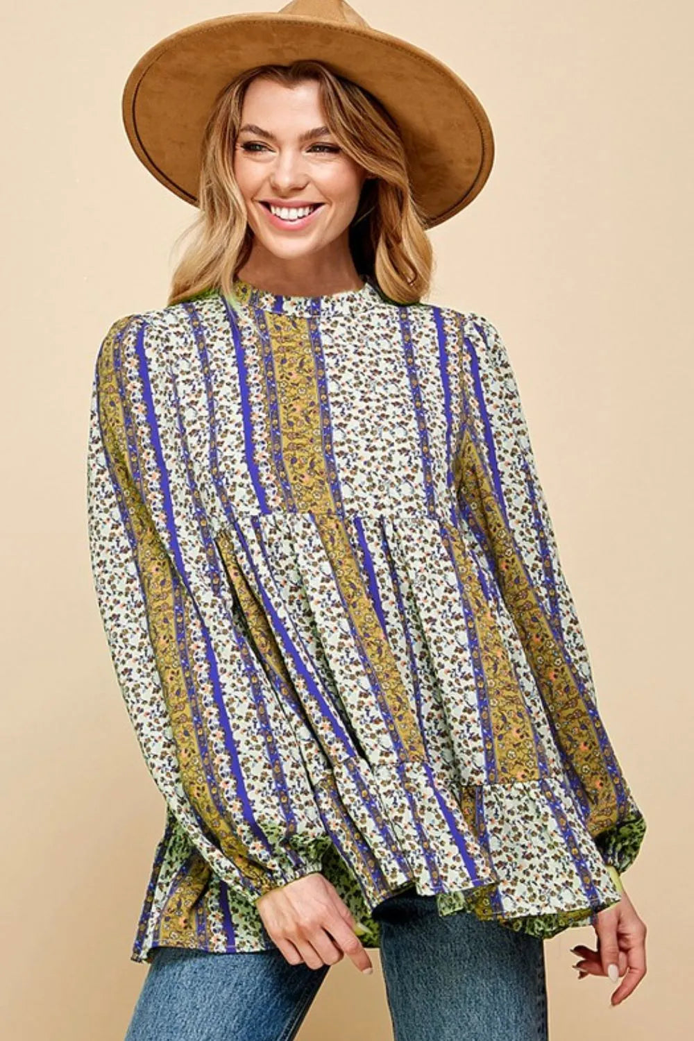 This babydoll top showcases a vibrant multi-color bohemian print for a free-spirited and playful look. The mock neck adds a touch of sophistication, while the babydoll silhouette creates a flattering and flowy fit. The combination of the bohemian print and babydoll shape gives this top a unique and whimsical style. Made with high-quality fabric, this top offers both comfort and a fashionable statement. Elevate your wardrobe with this chic and versatile top that effortlessly combines bohemian prints with a modern silhouette for a trendy and eye-catching outfit.