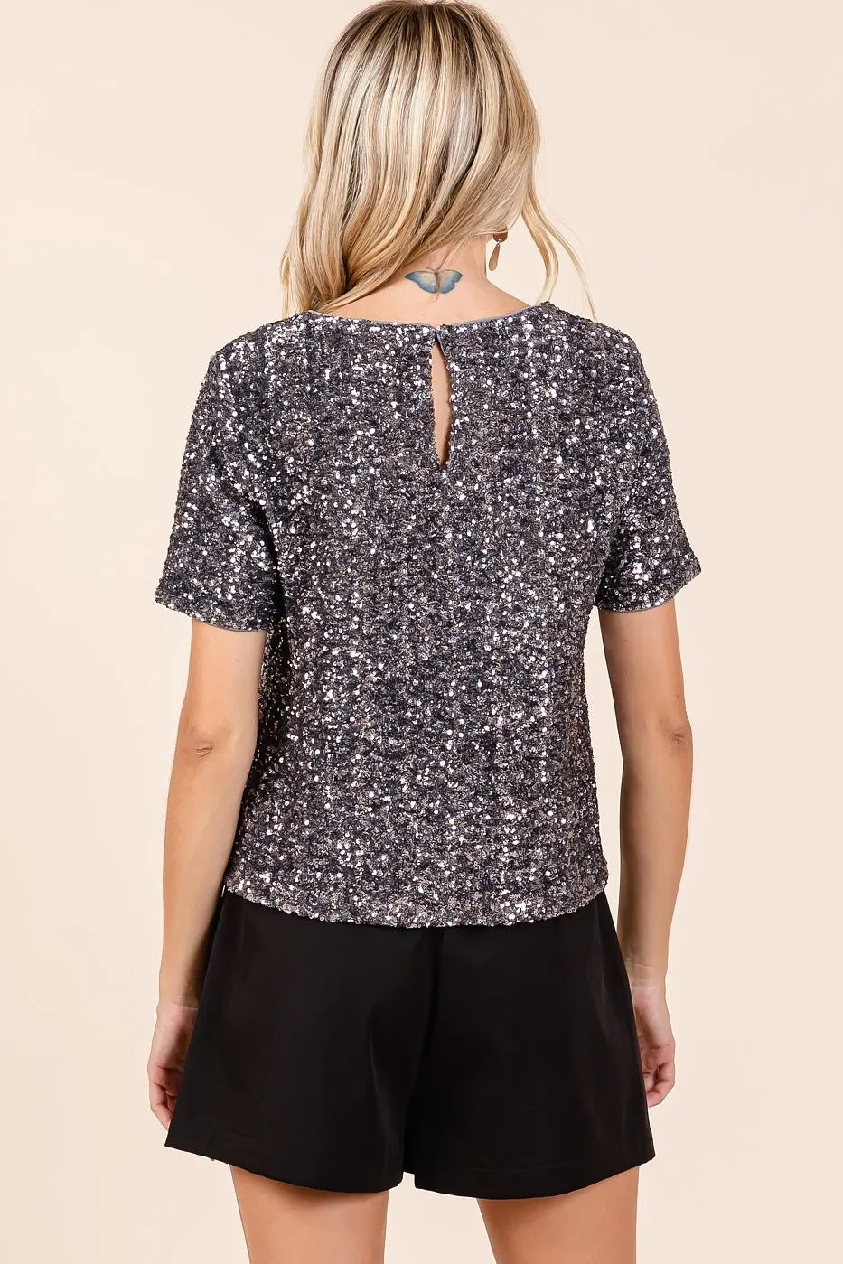 Mittoshop Sequin Short Sleeve Round Neck Cropped Blouse