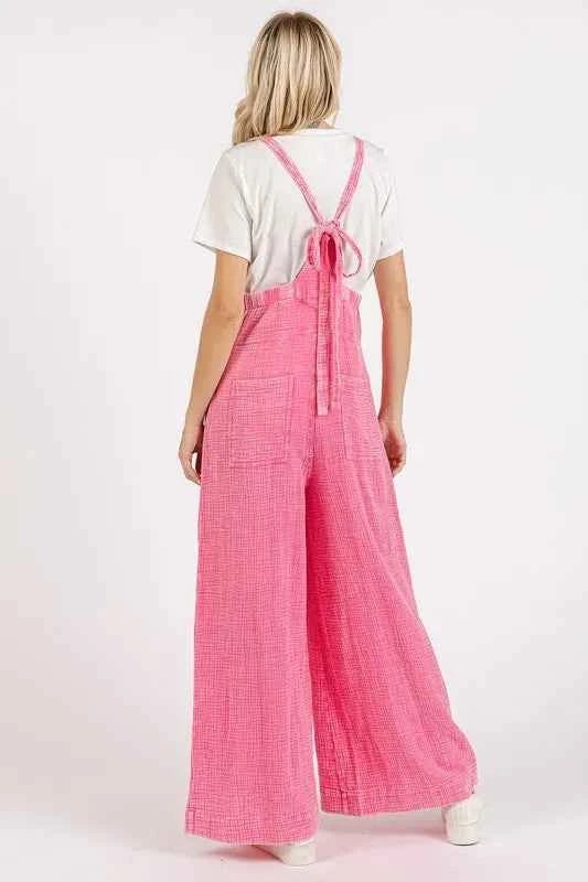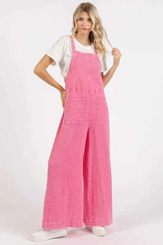 The Textured Wide Leg Overalls is a stylish and contemporary outfit choice. The textured fabric adds visual interest and depth to the overall look, making it a versatile option for various occasions. The wide leg cut offers a comfortable and flattering silhouette that is both trendy and elegant. This jumpsuit can be dressed up with heels and statement jewelry for a sophisticated evening look, or dressed down with sneakers for a more casual vibe. Its versatility and unique texture make it a standout piece in any wardrobe.