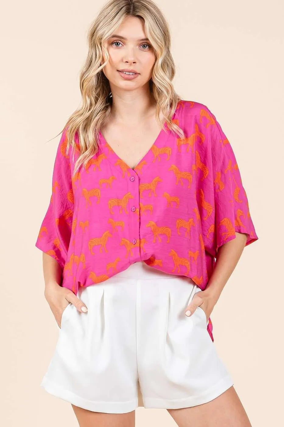 Mittoshop Zebra Print V-Neck Button Down Dolman Sleeve Top