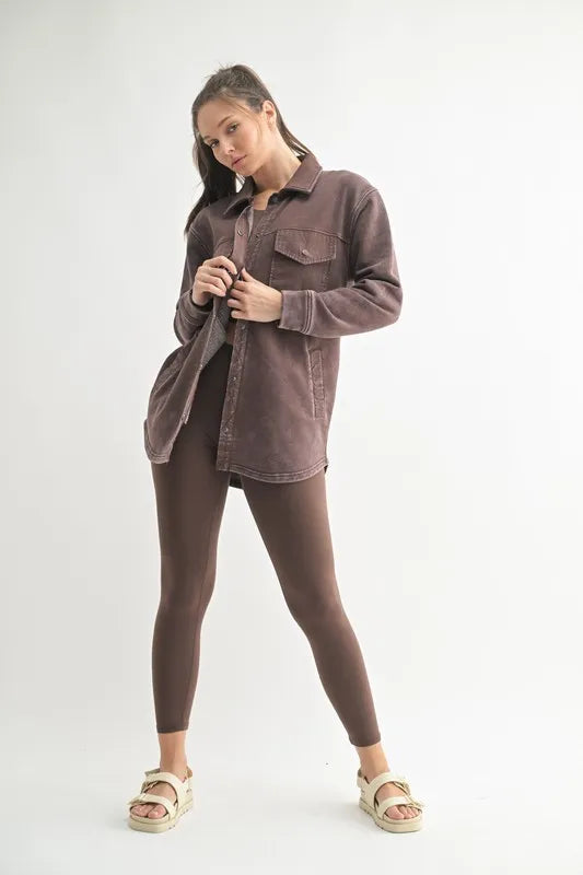 A snap-on shacket with pockets is a versatile and trendy clothing item that combines the style of a shirt and the functionality of a jacket. The snap-on design makes it easy to wear and adds a modern touch to the traditional shirt-jacket silhouette. The addition of pockets offers practicality for storing small essentials or keeping your hands warm. This shacket can be styled in various ways, whether as an extra layer over a t-shirt or as a standalone top. It can be paired with jeans, leggings, or even a dress for a chic and effortless look. The snap-on shacket with pockets is a fashionable choice for adding a layer of warmth and style to your outfit in transitional weather.
