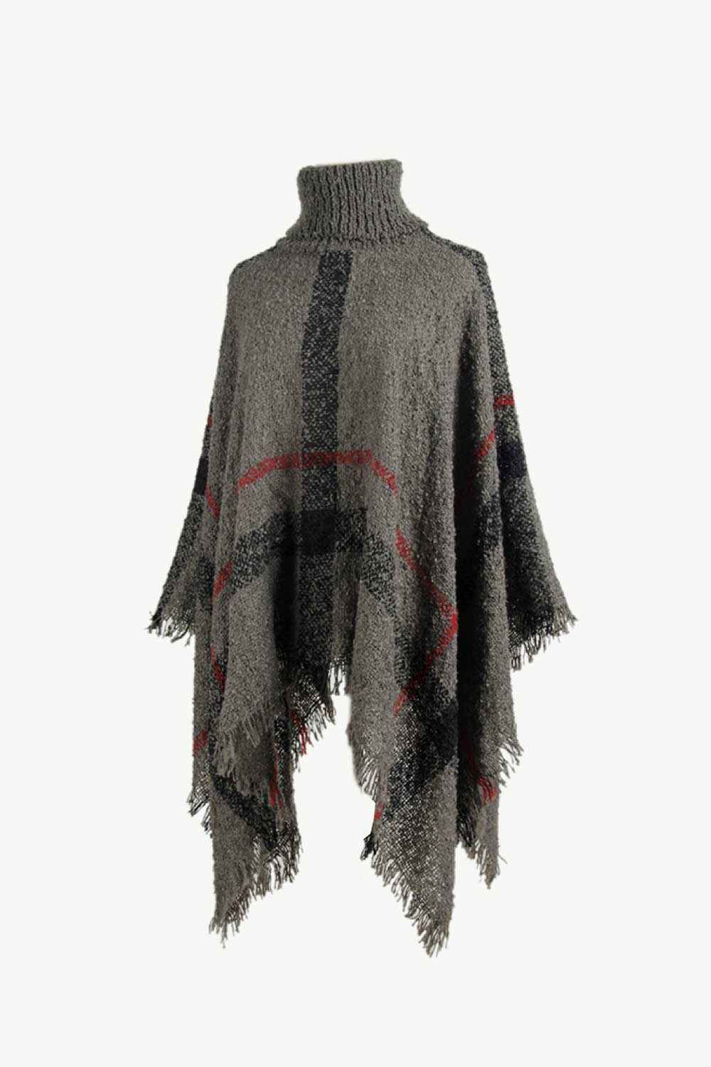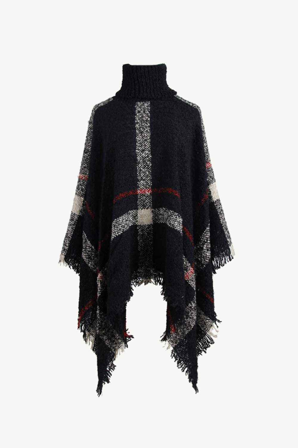 Plaid Turtleneck Raw Hem Poncho