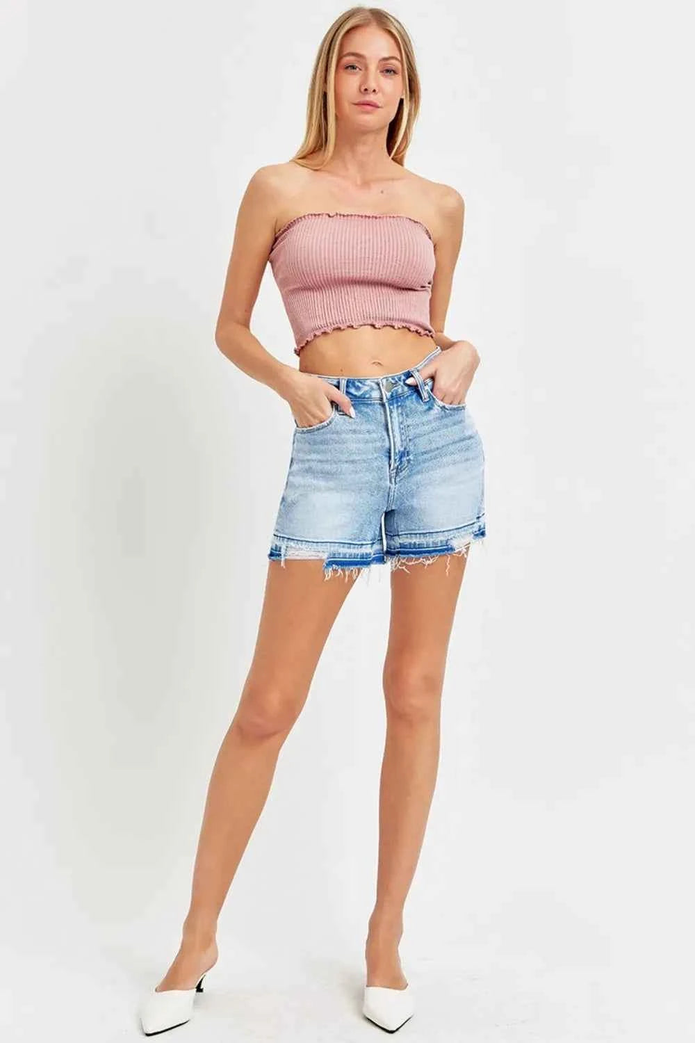 Add a touch of edgy style to your summer wardrobe with these high rise distressed hem denim shorts. The high rise fit offers a flattering silhouette, while the distressed hem detailing brings a trendy and relaxed vibe to your look. Pair these shorts with a casual top and sandals for a laid-back yet fashionable ensemble. Perfect for sunny days and casual outings, these versatile shorts provide both comfort and style. Elevate your summer wardrobe with these on-trend denim shorts that exude a cool and effortless charm. Make a fashion statement with these high rise distressed hem denim shorts and showcase your unique sense of style wherever you go.
