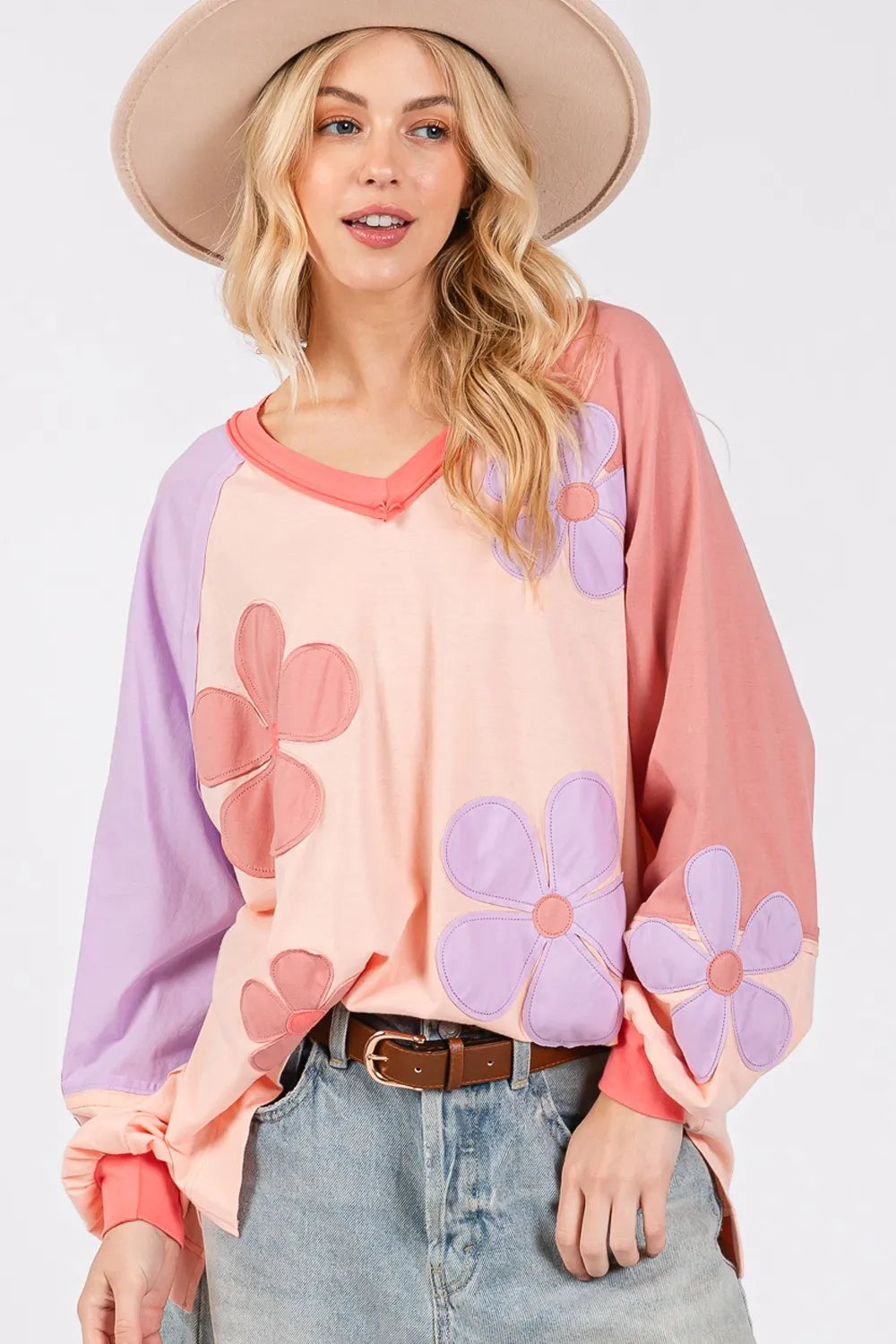 SAGE + FIG Full Size Daisy Applique Patch Color Block Long Sleeve Top