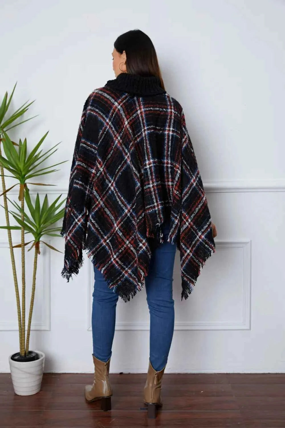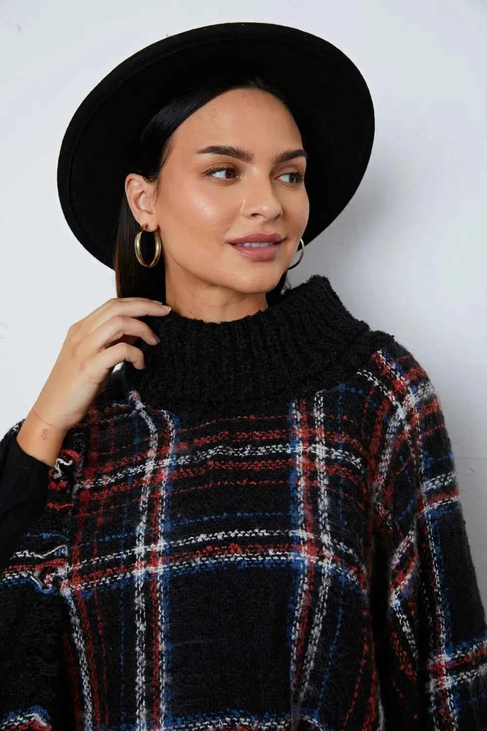 Shiny Turtleneck Plaid Raw Hem Sweater