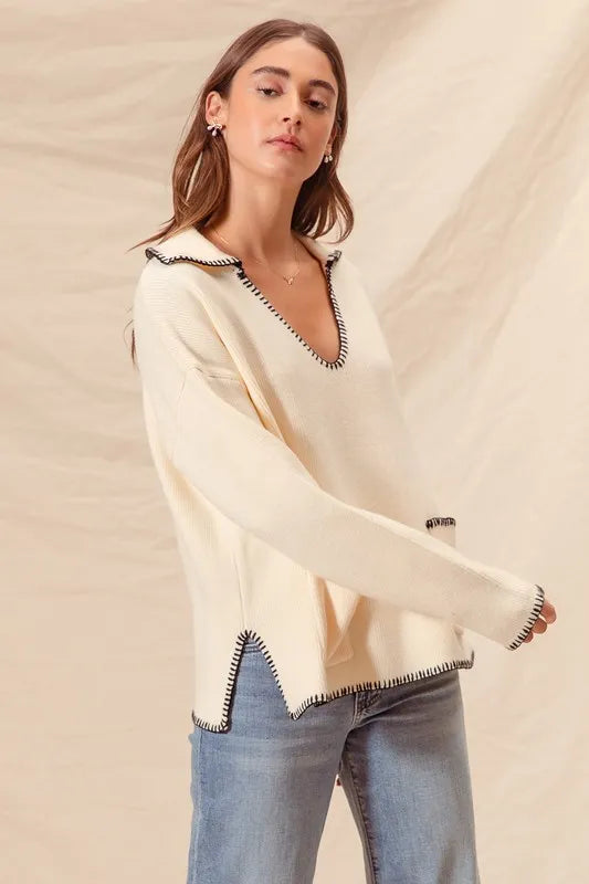Add a touch of boho-chic to your wardrobe with this Contrast Blanket Stitch Sweater. The blanket stitch detailing brings a unique and artisanal look to the sweater. The contrasting threads create visual interest and texture. Perfect for layering or wearing on its own, this sweater is versatile and stylish. Elevate your casual outfits with this cozy and on-trend piece.