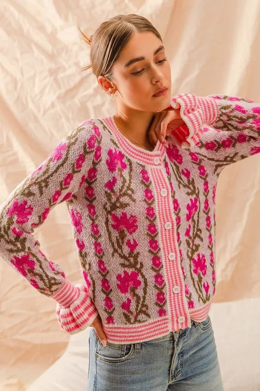 SO ME Floral Intarsia Button Up Sweater Cardigan