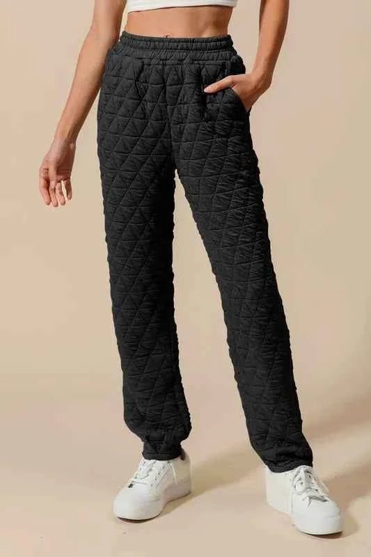 Stay comfortable and stylish in these Triangle Quilted Straight Jogger Pants. The quilted design adds a unique and trendy element to the classic jogger style. The straight leg cut offers a versatile and flattering fit. Perfect for both lounging at home or running errands, these jogger pants combine fashion and comfort seamlessly. Elevate your casual look with these chic and cozy triangle quilted jogger pants.
